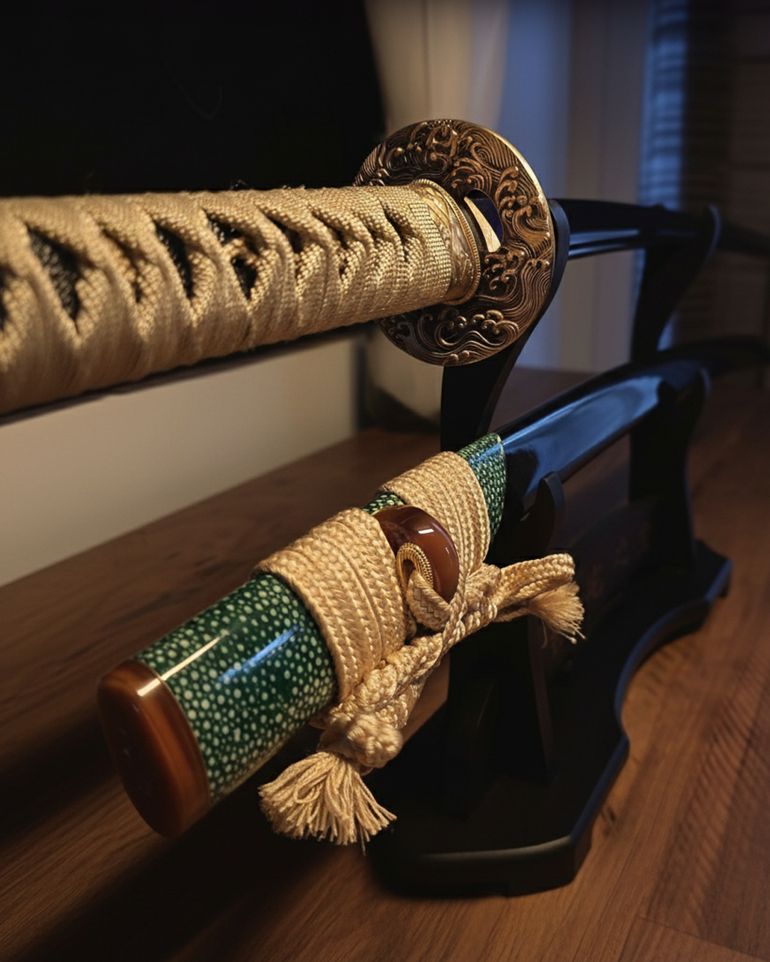 A traditional katana with folded or Damascus steel offers strong visual appeal. Consider your fittings (tsuba design, menuki style, saya finish) and optional engraving for a display-ready masterpiece.