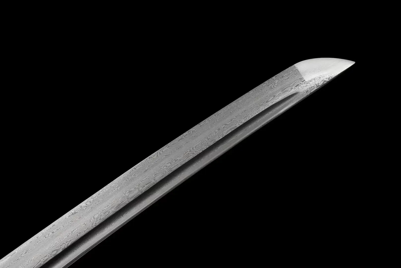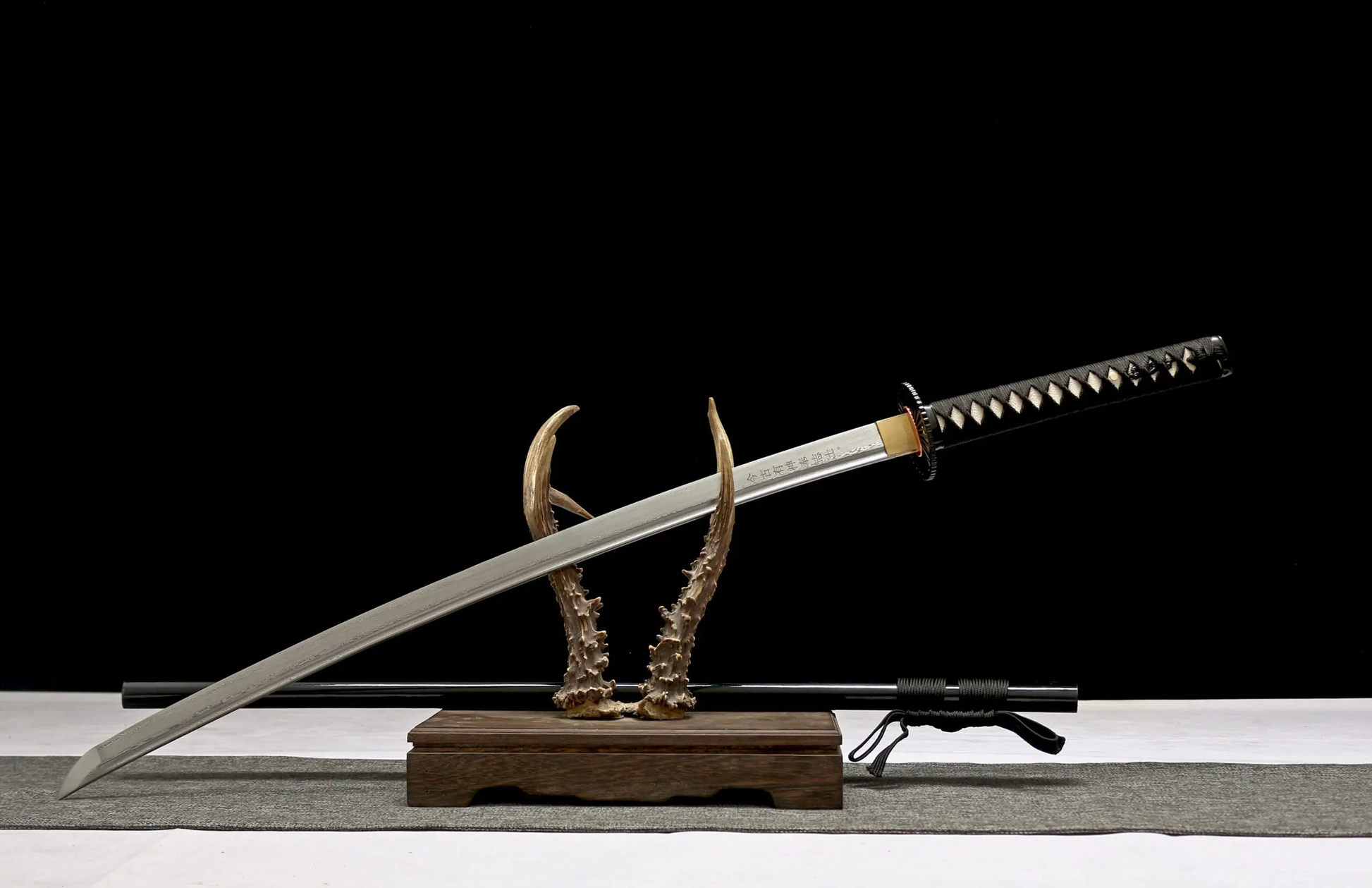 Hand-forged from layered Damascus steel, this katana showcases a rippling pattern along its 72 cm (28 in) sharpened blade. Built with a full tang core for enduring strength, the weapon measures 105 cm (41 in) in total, with a width of 3.2 cm (1.2 in) and a thickness of 0.7 cm (0.27 in). The 30 cm (11.8 in) handle is wrapped in black PU leather ito over **genuine rayskin**—not imitation—offering a rare textural authenticity. Reinforced with a full silk lining and secured by a matching PU leather sageo, it is finished with an iron tsuba that reflects the minimal yet bold styling seen in the film. Ideal for display, cosplay, or non-contact martial forms, this piece speaks as loudly in presence as it does in precision.